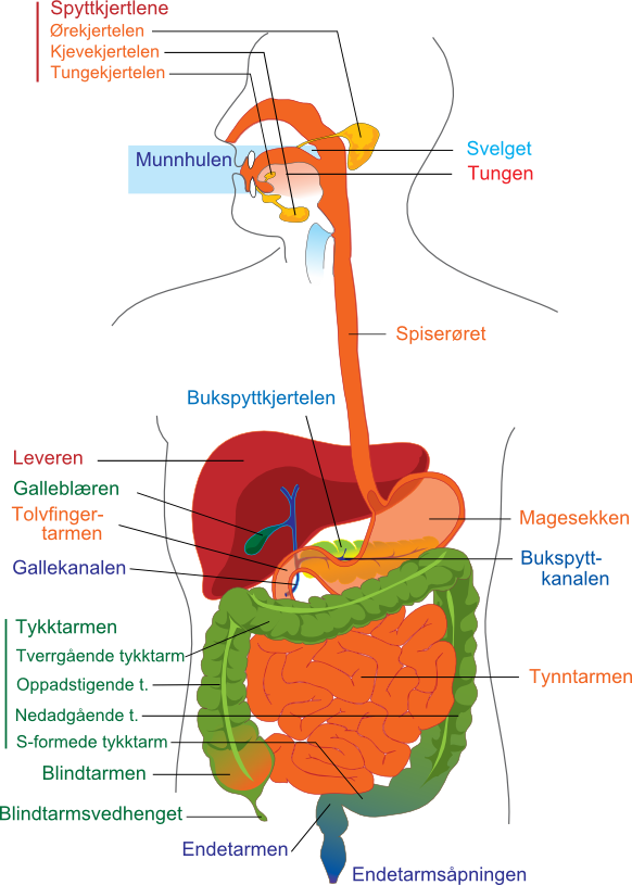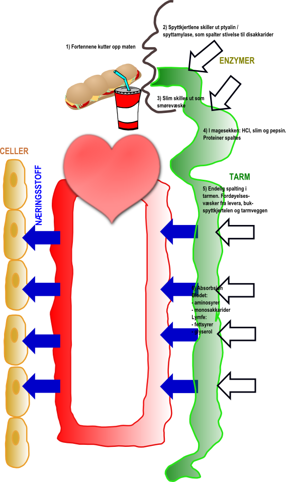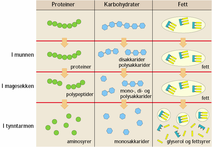 | tolvfinger-tarmen | Amylase fra bukspyttkjertelen spalter stivelse til maltose. Maltase spalter maltose til glukose. | Trypsin fra bukspyttkjertelen spalter proteiner til dipeptider | Galle fra levera finfordeler fettet. Lipase fra bukspyttkjertelen spalter fettet til fett, fettsyrer og glyserol |