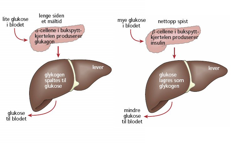 | Glukagon | Lever og muskler |
